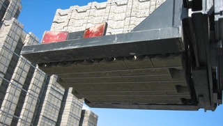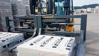 KAUP Block and Brick Clamps T412H are used for handling small format blocks such as building bricks and paving stones. The grease filled clamping arms of this attachment have mechano-hydraulic equilibration pistons with different coatings. They adapt to irregular shaped loads and can therefore clamp the load as required. Steel plates for handling rough, hard, heavy concrete blocks, rubber coating for pick up of aerated concrete blocks and Vulcollan coating as an all-rounder are just some of the possibilities available.