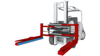 KAUP Block Clamps T412UVP are the most suitable attachment when handling is frequently changed between pick up of pallets or grate boxes and handling packets of blocks. This attachment can be used as a Block Clamp and also as a Fork Clamp. Therefore they are typically used in the building industry.