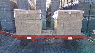 Why? MEIER has optimised its logistics and storage. It is planned to always load two brick packs onto small but very stable trailers for transport to the MEIER outdoor storage area. Several trailers in turn form a type of train. On arrival at the outdoor storage area, the trailers should be emptied as quickly as possible. To do this, both packs must be picked up in one loading operation, brought to the intended position in the outdoor storage area and deposited there. And for this a special block clamp model is used in Middle Franconia: a double block clamp 5T412H-2 suitable for the carrier vehicle Hyundai 70D-9.
