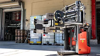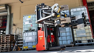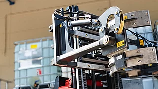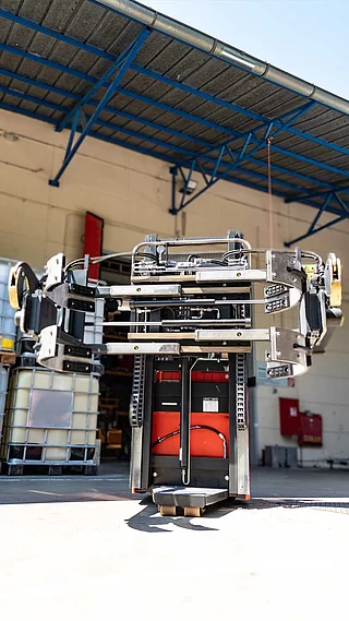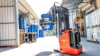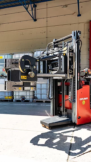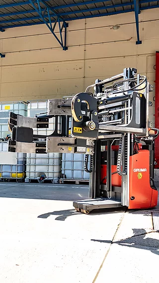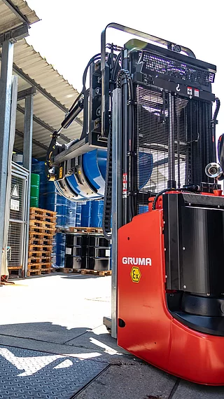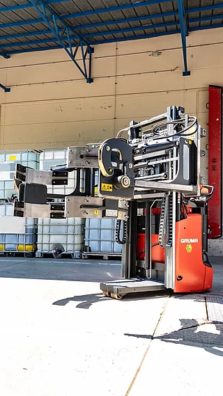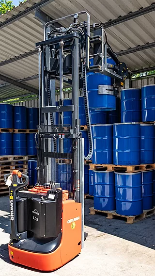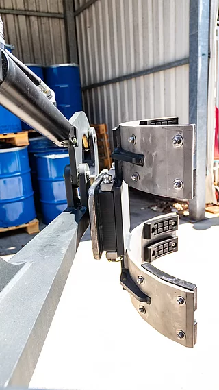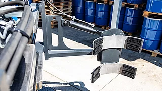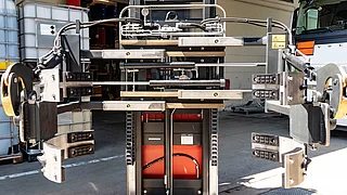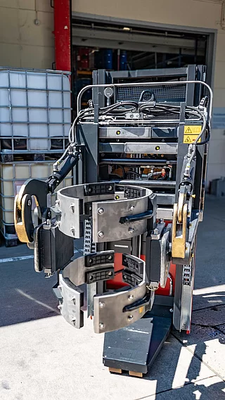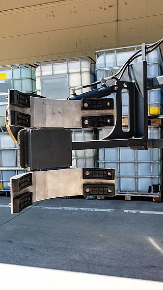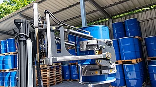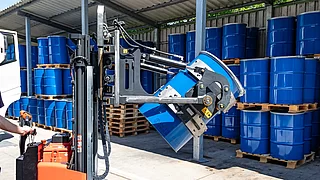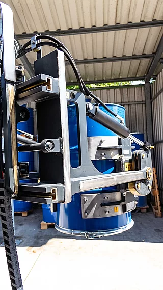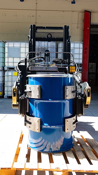 Steel and plastic drums of different dimensions are placed next to each other on CP3 pallets. The clamp is designed to grip and lift these drums hydraulically and, if necessary, empty them entirely – for example, into IBC containers.