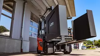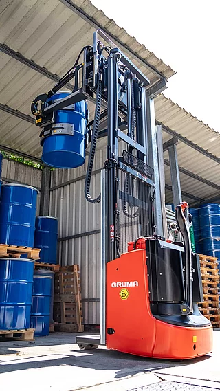 - A Drum Tipping Clamp 1.5T406-2H/EX with two pairs of changeable, slip-on clamp units, adapted to a Linde L03 EX high-lift truck with manual control of the Drum Tipping Clamp.