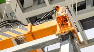 Doch der Portalkran wäre nichts ohne ein passendes Gerät, um die Container zu bewegen. In diesem Fall ist es ein dahliengelber Container Spreader 7T191K10-20/8-9 von KAUP. Hinter dem etwas sperrigen Zahlencode verbirgt sich ein Spreader mit Doppelrahmenkonstruktion, der quer stufenlos von 2.990 bis 6.190 mm teleskopierbar ist. Das ermöglicht die Aufnahme der leeren, unterschiedlich großen Wohn- und Büromodule von oben sowie der passenden Treppenhäuser. Doch das Besondere an diesem Spreader ist nicht etwa seine Farbe, sondern die Art der Ladungsaufnahme.